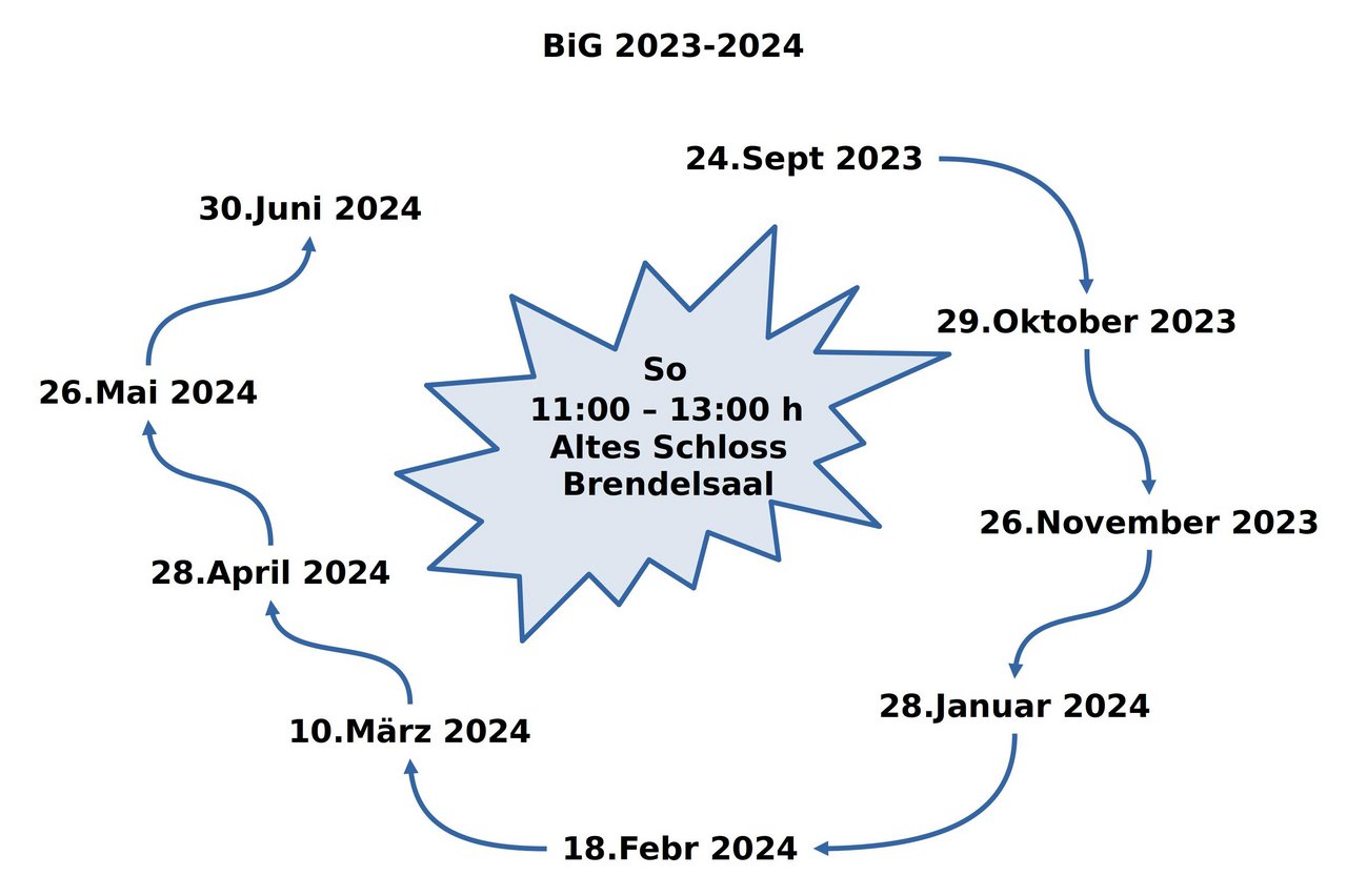 Welche Veranstaltungen dann tatsächlich stattfinden, und wo, das wird jeweils über den BiG-Rundbrief mitgeteilt (Anmeldung: big@oksimo.org).  Die bisherigen Rundbriefe kann man hier einsehen: https://www.oksimo.org/big-rundbrief/