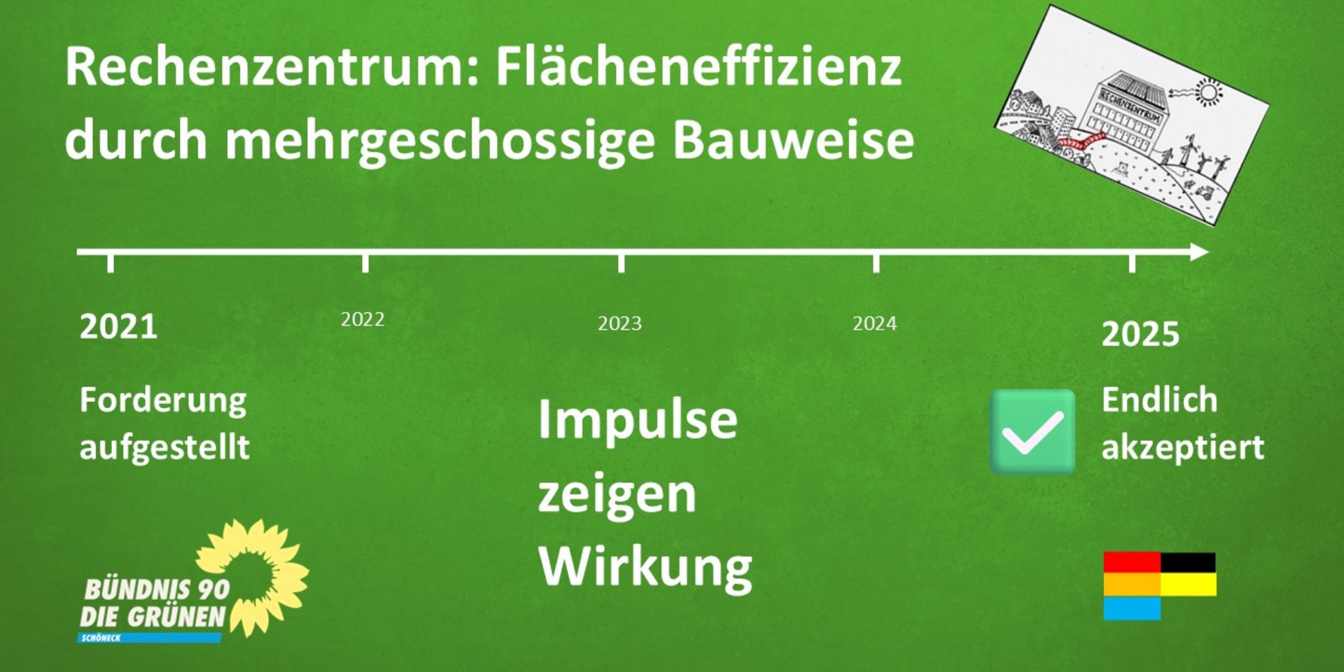 Schönecks Grüne begrüßen, dass mit dem Neustart des Rechenzentrumsprojekts ihre seit 2021 erhobene Forderung nach verdoppelter Flächeneffizienz umgesetzt wird und stimmten deshalb dem geänderten Bebauungsplan zu. Mehr Transparenz und verbindliche Anreize zur Nutzung der Abwärme fordern sie im Bieterverfahren bislang jedoch ohne Erfolg.