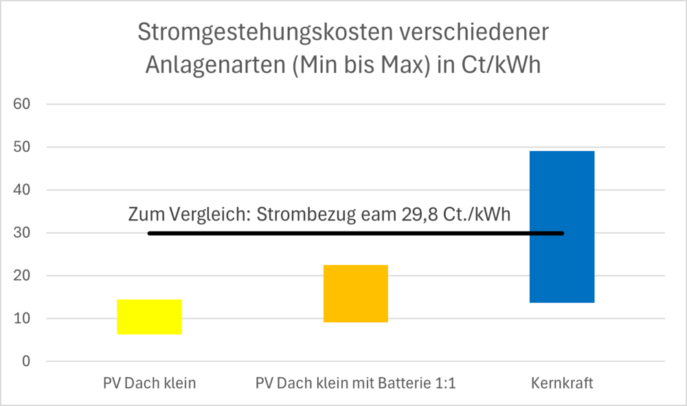 „Photovoltaik ist längst kein Luxus mehr. Eine aktuelle Studie zeigt, dass selbst erzeugter Sonnenstrom mit 6,3 bis 14,4 Cent pro Kilowattstunde weit unter den derzeitigen Netzstrompreisen von fast 30 Ct/kWh liegt. Das bedeutet für Familien konkret: Eigenstrom entlastet spürbar das Haushaltsbudget“, betont Wolfgang Seifried, Fraktionsvorsitzender der Grünen in Schöneck. Strom aus neuen Atomkraftwerken koste gar zwischen 13,6 und 49 Ct/kWh, ohne Kosten für die ungelöste Endlagerproblematik, ergänzt Seifried. Selbst große deutsche Energieversorgungsunternehmen lehnen daher den Wiedereinstieg in die Atomkraft ab, da sie darin wirtschaftlich keine Zukunft sehen.