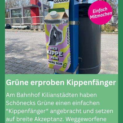 08.04.26 - Am Fahrradständer des Bahnhofs Kilianstädten haben Schönecks Grüne einen einfachen „Kippenfänger“ angebracht. Es soll erprobt werden, ob das Konzept geeignet ist, die Kippenflut an viel frequentierten Treffpunkten in den Griff zu bekommen. Weggeworfene Kippen sind ein großes…
