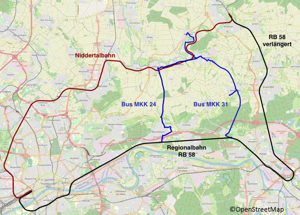 Für Pendler*innen aus Nidderau könnte die Regionalbahnlinie RB58 Frankfurt-Hanau bei einer Verlängerung bis Friedberg zu einer attraktiven Alternative werden, erläutert Walter Heidrich vom Nidderauer Ortsverband der Grünen: „Man kennt diese Verbindung bereits aus der Zeit der Bauarbeiten auf der Main-Weser-Bahn zwischen Frankfurt und Bad Vilbel, als Züge von Frankfurt über Hanau bis nach Marburg verkehrten. Ein von den Anrainerkommunen zusammen mit der IHK beauftragtes Gutachten hat bestätigt, dass zwischen Hanau und Friedberg noch Kapazitäten zur Verlängerung der RB58 verfügbar sind.“