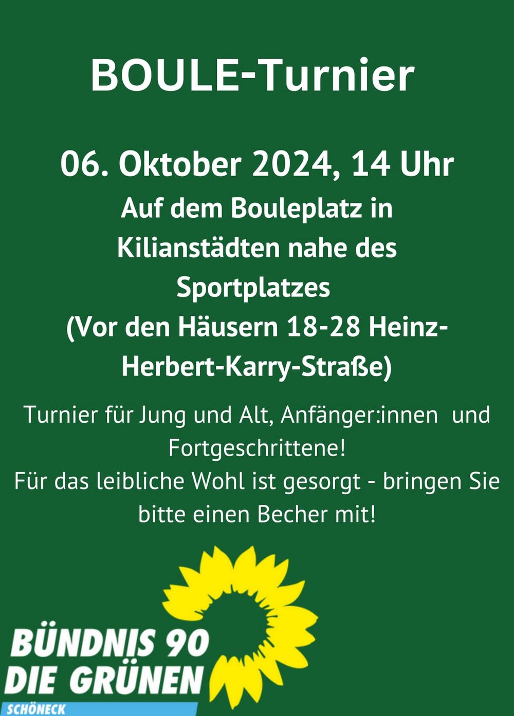 Bei einem Boule-Turnier am 6. Oktober 2024 haben Jung und Alt, Anfänger und fortgeschrittene Spielerinnen die Gelegenheit, mediterrane Lebensart zu erleben. Bündnis 90/Die Grünen laden um 14.00 Uhr auf den Bouleplatz in Kilianstädten nahe des Sportplatzes (vor den Häusern Heinz-Herbert-Karry-Straße 18-28) ein. Für das leibliche Wohl ist gesorgt. Die Spielerinnen und Spieler werden gebeten, Getränkebecher mitzubringen.