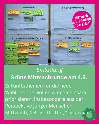 Den Blick nach vorn werfen Schönecks Grüne in ihrer monatlichen Mitmachrunde. Sie möchten besprechen, welche Zukunftsthemen sie in der neuen Wahlperiode ab dem 15.3. priorisieren wollen, vor allem aus der Perspektive junger Menschen. Dazu haben die Grünen die Thementafel aufgeräumt, mit deren Hilfe sie ihre Arbeit strukturieren. Die Tafel ist damit bereit, um Punkte aus dem Wahlprogramm oder auch neue Punkte aufzunehmen, um sie in einer geeigneten Form umzusetzen. Alle, die Schöneck mitgestalten wollen, sind herzlich zum Mitmachen eingeladen.