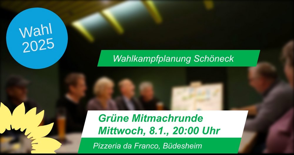Am Mittwoch, 8.1.2025, findet die monatliche Mitmachrunde von Bündnis 90/Die Grünen Schöneck statt. Natürlich wollen wir uns dieses Mal mit den Wahlkampfplanungen für die Bundestagswahl am 23.02. beschäftigen. Wer sich in Schöneck noch einbringen möchte, ist herzlich eingeladen zu dem Treffen um 20.00 Uhr in der Pizzeria da Franco (Vilbeler Straße 46, Büdesheim).