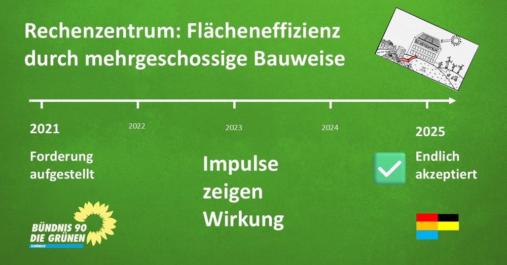 Schönecks Grüne begrüßen, dass mit dem Neustart des Rechenzentrumsprojekts ihre seit 2021 erhobene Forderung nach verdoppelter Flächeneffizienz umgesetzt wird und stimmten deshalb dem geänderten Bebauungsplan zu. Mehr Transparenz und verbindliche Anreize zur Nutzung der Abwärme fordern sie im Bieterverfahren bislang jedoch ohne Erfolg.