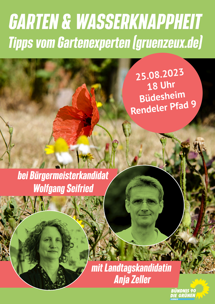 Zu einer Informationsveranstaltung „Gartengestaltung und -pflege im Zeitalter der Wasserknappheit“ lädt Bürgermeisterkandidat Wolfgang Seifried am Freitag, den 25.08.2023 um 18:00 Uhr in seinen Garten im Rendeler Pfad 9 in Büdesheim ein. Seifried: „Unser Reihenhausgarten ist wohl nicht untypisch und wurde einst angelegt mit viel Rasen und Spielgeräten für die Kinder. So stellt sich der Garten auch heute noch dar. Die Kinder sind dem jedoch längst entwachsen, weshalb sich die Frage stellt, wie so ein Garten künftig umgenutzt werden könnte. Möglichst insektenfreundlich, wenig pflegeintensiv und wassersparend, da sich angesichts der Erderhitzung nach Einschätzung der Forschung die Trockenphasen mehren werden. Dennoch soll ein Garten auch ein Wohlfühlraum bleiben, in den man sich gerne zurückzieht.“ Einen Einblick in die Möglichkeiten größerer und kleiner Umgestaltungen und Nutzungsänderungen gibt Gartengestalter Andreas Homrighausen (www.gruenzeux.de). Die Direktkandidatin der Grünen für die Landtagswahl, Anja Zeller, steht ebenfalls zum Gespräch zur Verfügung. Da der Garten in einem Wohngebiet liegt, wird auf die eingeschränkte Parkplatzverfügbarkeit hingewiesen und darum gebeten – sofern möglich – ohne PKW zu kommen.