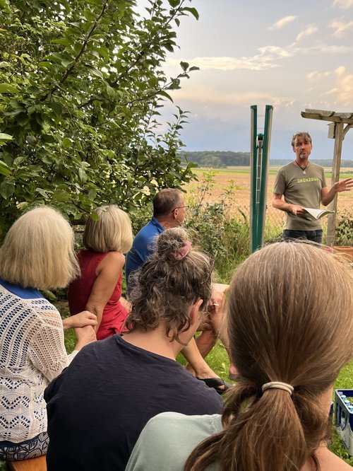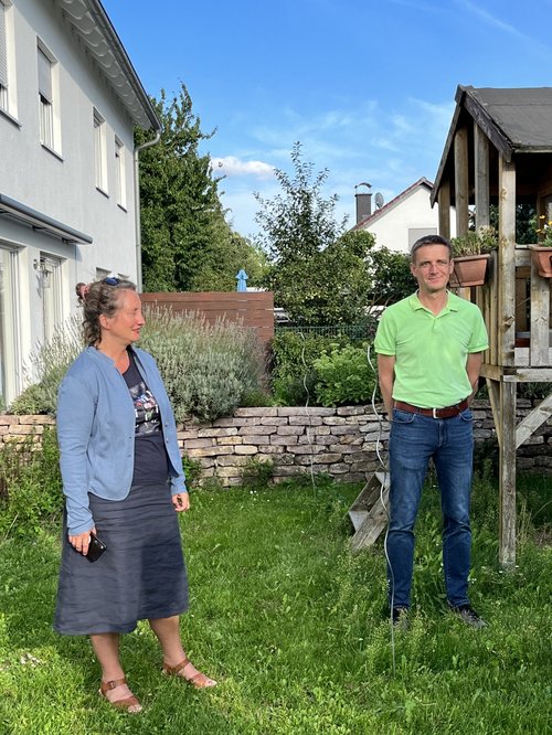 25.08.2023. Bürgermeisterkandidat Seifried bot mit seinem Reihenhausgarten als Anschauungsobjekt eine typische Ausgangssituation für eine Umgestaltung an. Er beschrieb das Spannungsfeld zwischen bisheriger Nutzung und den Anpassungsnotwendigkeiten an die Wasserknappheit und für Artenvielfalt. Ebenso schilderte er die bisherige Entwicklung des Gartens mit viel Rasenanteil und Spielgeräten für die Kinder, die dem inzwischen aber entwachsen seien. Vor wenigen Jahren wurde der ramponierte Rasen noch durch einen neuen Rollrasen ausgetauscht. Es sei aber wohl so, dass man mit einem schönen grünen Rasen möglicherweise dem falschen Ideal hinterherjage.