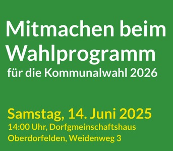 Die Kommunalwahl im März 2026 wirft ihre Schatten voraus – doch bevor über fertige Programme und Kandidierende diskutiert wird, laden Bündnis 90/Die Grünen Schöneck alle Interessierten herzlich ein, selbst mitzumachen: Am Samstag, den 14. Juni 2025, findet von 14 bis 18 Uhr im Dorfgemeinschaftshaus Oberdorfelden (Weidenweg 3) ein öffentlicher Ideen-Workshop statt.