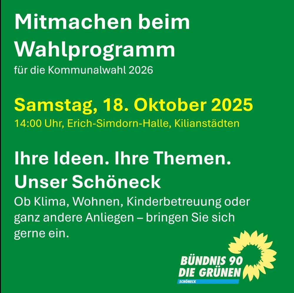 Noch gut fünf Monate sind es bis zur Kommunalwahl im März 2026. In einer öffentlichen Workshop-Serie erarbeiten Bündnis 90/Die Grünen ein Wahlprogramm für Schöneck. Alle Interessierten sind herzlich eingeladen, selbst mitzumachen. Der nächste Workshop findet statt am Samstag, den 18. Oktober 2025, von 14 bis 18 Uhr in der Erich-Simdorn-Halle Kilianstädten (Bleichstraße 9).