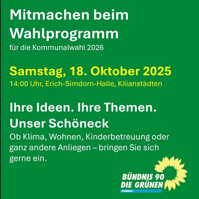 Noch gut fünf Monate sind es bis zur Kommunalwahl im März 2026. In einer öffentlichen Workshop-Serie erarbeiten Bündnis 90/Die Grünen ein Wahlprogramm für Schöneck. Unabhängig vom Parteibuch sind alle herzlich eingeladen, selbst mitzumachen. Der nächste Workshop findet statt am Samstag, den 18. Oktober 2025, von 14 bis 18 Uhr in der Erich-Simdorn-Halle Kilianstädten (Bleichstraße 9).
