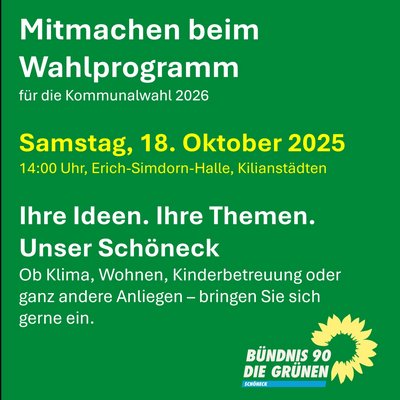 Noch gut fünf Monate sind es bis zur Kommunalwahl im März 2026. In einer öffentlichen Workshop-Serie erarbeiten Bündnis 90/Die Grünen ein Wahlprogramm für Schöneck. Unabhängig vom Parteibuch sind alle herzlich eingeladen, selbst mitzumachen. Der nächste Workshop findet statt am…