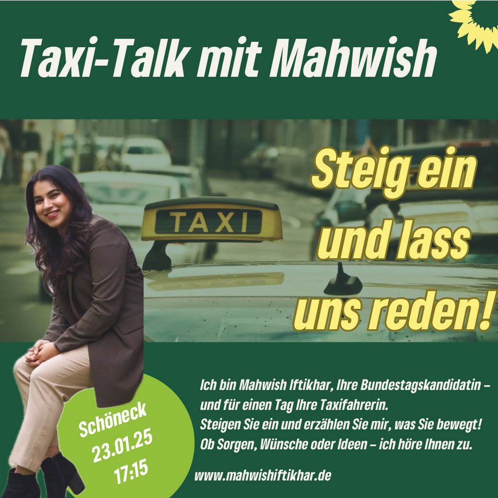 Am Donnerstag, den 23. Januar steht die Bundestagskandidatin der Grünen, Mahwish Iftikhar, ab 17:15 Uhr am Bahnhof Kilianstädten zum Gespräch in einem Großraum-Taxi bereit – für nachhausekommende Pendlerinnen und Pendler der Niddertalbahn oder für andere Interessierte. Die 25-jährige Politikwissenschaftlerin hatte sich während ihres Studiums durch Taxifahrten Geld dazuverdient.